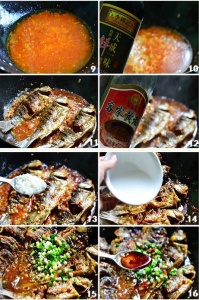 14、鱼一面烧入味后,轻轻翻到另一面再烧,快收汁时,调入薄水淀粉。