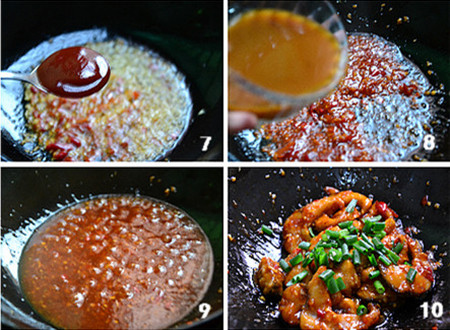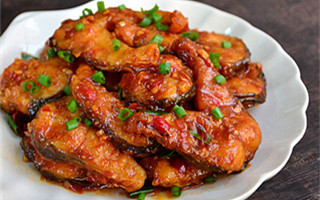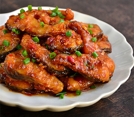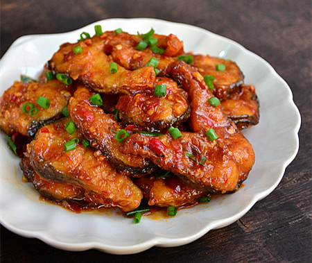 10、加入煎好的鱼块,轻轻翻动,或推锅至鱼块均匀挂汁后,加入葱绿翻动两下,即成。