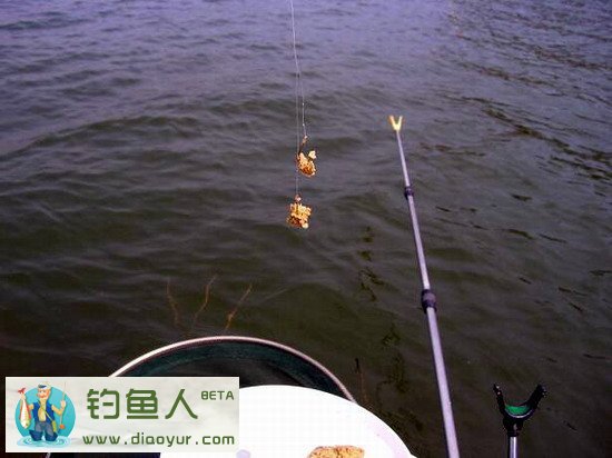 打窝用的鱼食有两种:一种是用豆饼、麦麸、酒糟之类的粗杂粮的细粉,加点有香味有粘性的粉料,放点水拌和做成蚕豆大的颗粒,大的如核桃大小圆球,晒至半干后使用,一般每个窝投放3~5颗;另一种是用米饭晒成干粒或直接用碎米,每个窝投撒一小把。