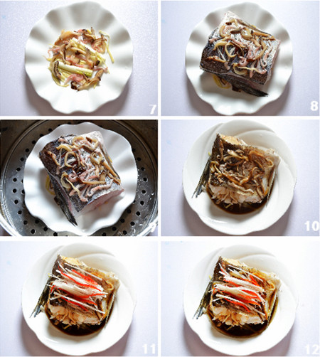 8、将鱼腩放在上面,在鱼身上铺另一半香菇丝和肉丝。