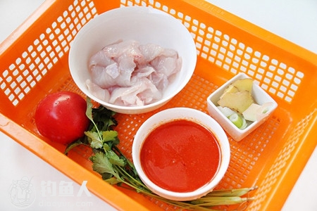 黑鱼片250克、凯里红酸汤200ML、西红柿1个、葱段少许、姜5大片、水1L、香菜少许、淀粉1小勺、高汤2小勺、黄酒1小勺、蛋清1小勺、盐少许、植物油少许。
