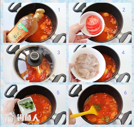 3、水烧开之后加入少许浓缩高汤或者鸡粉,加入切好的西红柿片,盖上盖子继续煮5分钟,然后加入鱼片滑动30秒关火,放入香菜拌匀即可。