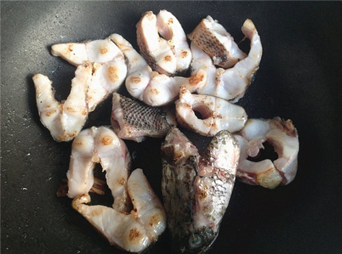3、炒锅烧热加少许玉米油把鱼块放入小火煎至两面微。