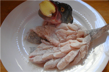 2、鱼头斩下后,鱼嘴里面放上一个姜块,炸制时,可以保持鱼嘴张开。鱼身由中间切开,鱼尾部不能切断,踢掉中间的鱼骨,在鱼肉侧打上花刀。然后在撒上玉米淀粉。