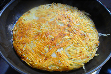 3、土豆不用去皮,洗净以后擦成丝,加入盐拌匀,如不粘锅煎制成饼。