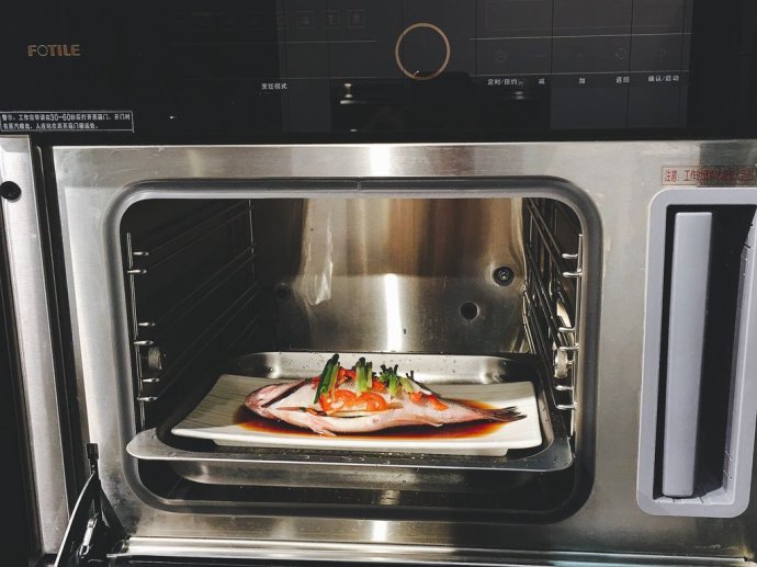 6. 蒸制:取出蒸箱内的有孔蒸盘,水箱加满水,选择“蒸鱼”模式,设置100℃,定时10分钟,确认开启。
