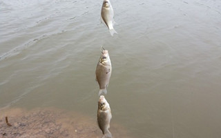 8时才到水库。小张主钓海竿加炸弹钩并兼钓手竿,我主钓海竿加串钩。开钓不到半小时,我串钩就上了8条鲫鱼,而小张用炸弹钩才钓上1条鲫鱼,手竿则没任何反应。9时多以后,鱼咬钩少了。我打下去串钩等了3——5分钟没鱼咬钩,就先“以动制静”:弹拨了两下渔线,以让水底下鱼钩上蚯蚓动起来;过了3——5分钟还没有鱼咬钩,就再重复前面的动作。这样做,一般只要附近有鱼,就会奏效,以往我用这种方法,曾屡试不爽。果然,两根用串钩的海竿第一弹就引鱼上了钩,第二弹竟让一根竿来了个大满冠:三只钩被三条鲫鱼同时咬上,一串三条。有时候,弹了两三次线还没鱼咬,说明那副钩打得远了,或附近没有鱼,我就再来个“步步为营”:把钩往回拉几米,再辅之以“以动制静”;还不行就再往同拉几米。这种方法以往使用也是很见效的,这不,我两根使串钩的海竿,经我这么一折腾,几乎是每发一钩,必有收获。