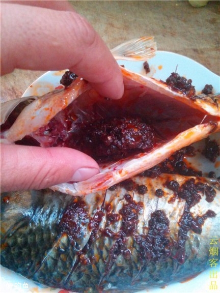 4、鱼肚里也不要忘了塞一些麻辣料,从内往外出味会更好。
