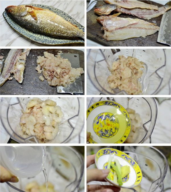 材料:大黄鱼一只(取鱼肉230克)、虾仁150克。