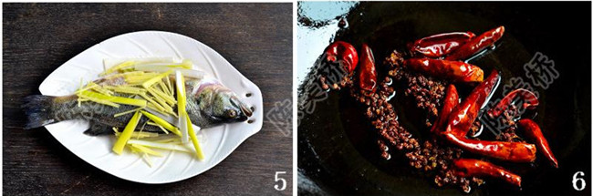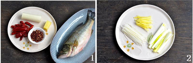 鲈鱼1条500克、大葱1段、姜1块、干辣椒1把、干花椒1汤匙、蒸鱼豉油3汤匙、盐适量、绍兴黄酒1汤匙、花生油4汤匙。