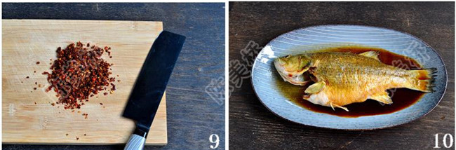 12、在刚刚炒双椒的锅里再放3汤匙花生油,油冒青烟时,趁热从鱼身的佐料上均匀淋下。