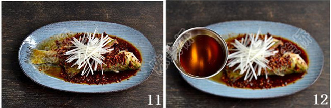 11、鱼身均匀放剁碎的刀口辣椒,上面铺上葱白丝。