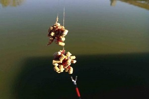 优点:简单方便,相对较为牢靠,不容易脱落,饵料附钩时间长,长时间可以不用换饵,可以使用逗钓等方式,刺激鱼类开口吞饵。