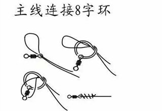 下图是子线同8字环的另一种连接方法。这种方法的拉力和上图比有所提高,不过,此结绑好后子线和主线的垂直度不好。好在有钩子和饵的重量,这个问题在实际钓鱼时不明显。