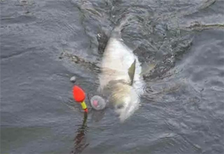浮漂要选用大型球状或棒球状、浮力较大者,且颜色要醒目,以便于钓远时能看得清楚,准确把握鱼讯。东北常用的是乒乓球,将其以黄布(或红或黑)包缝后再结线连接主线。华南多用白色泡沫块,块形可方可圆,绑线连结,块体要大些,以能吊浮起钓笼钩饵为准。