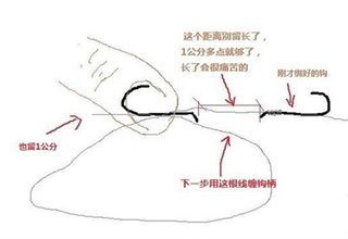 上面图片是绑单钩的方法,可以先练习一下,然后再绑双钩,新手先绑大钩,慢慢的再练习小钩,绑钩前要把子线准备你想要的长度,然后开始绑,线头最好放在钩内。