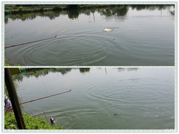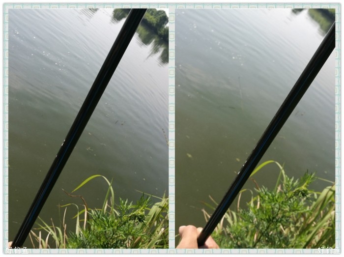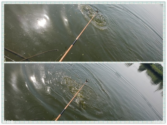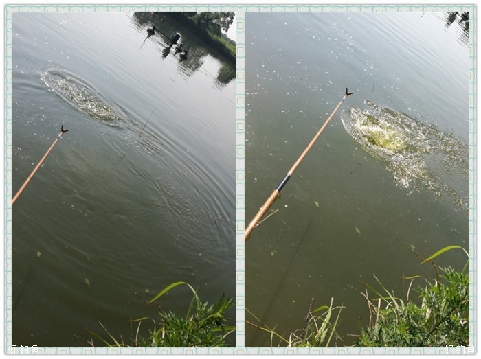 看着水面不断泛起的鱼花和混浊的水质,知道塘里的鱼密度不小,既然如此就不需要多考虑,放弃并继和小线组,直接上重磅,游龙4.5振出,3+2搭,金魔、金窝加金炮,偏干散,搓饵伺候,水深1.2,这种精养塘这种水深正适合。调高钓低,挂大饵第一竿下水浮漂就斜着走了,扬竿、外窜、切线一气而成,大大的意外,按我的理解,精养塘的鱼像是老爷,力道定是比不上水库或是野塘,3+2应该足可应付,仔细看了下子线的情况,切一线,尚存的另一线钩拉豁了,是双飞?还是两钩挂一条?钓友在旁哈哈大笑“叫你牛逼”,稍稍收起轻视之意,不想第二竿还是切,是好久没重装搏巨物,业务生疏了?还是争于求成欲速则不达?又或是精养塘的鱼也给出了水库的本色?不敢大意,子线加码、竿系失手绳,第三尾终于妥妥的入抄了。
