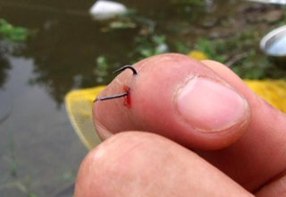 有时候钓鱼特别不顺,你越想快,它就越是出岔子。一会线缠住了,一会钩子挂在草上了,三抖四抖的,不想还挂到自己的衣服上去了,有些衣服还不好取钩,忙半天都弄不下来。这还不是最悲剧的,最悲剧的是鱼钩挂到肉里了,那是真正的把自己钓起来了,这么大的“鱼”,赶紧去医院取吧。