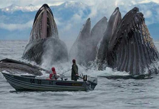 随后男子立刻将小船从这个领域划走,并在距离那些不断翻滚跳跃的大家伙大约只有几英寸的地方对它们进行观察。男子发现,原来夏季是驼背鲸出来觅食的季节,它们会不定期地涌出海面,并会做出让人震撼的动作。