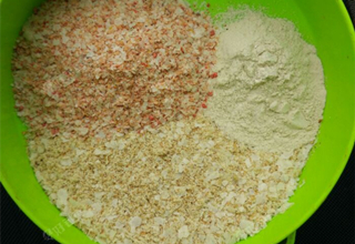 用所在地区平时投食喂鱼的饲料、鸡饲料、麸皮、玉米面、豆饼打磨成粉(具体比例看上方原料);