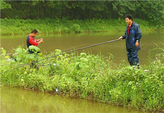 竿长从4.5--6.3米为野钓中常用钓竿,由于钓线甚长钓组是从岸边直接抛出。因此浮漂钩坠都应适当加大加重。钓钩可采用双钩或羊角钩进行垂钓。
