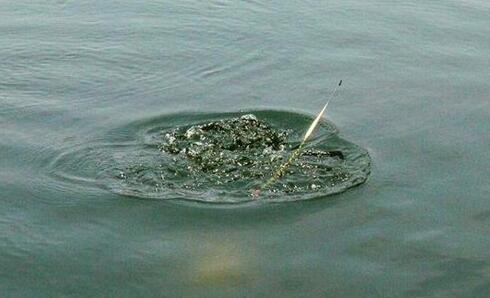 (7)再用配好的饵料捏成黄豆粒大小的圆球装在上下两个鱼钩上,投入水中,使浮漂再次沉没于水中。