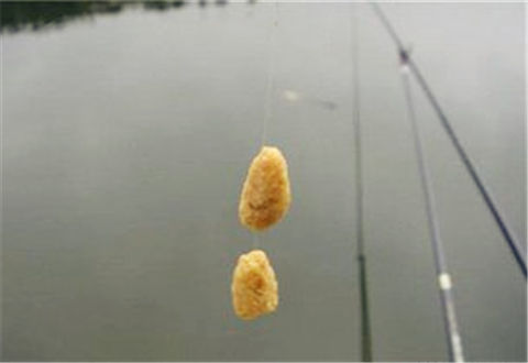 如果要用悬坠双钩钓法,可将上面的配饵方法调整为:鱼塘喂鱼用的颗粒饲料用水泡散后,加炒熟的黄豆粉、药酒米、面粉、拉丝粉,比例是3:1:1:0.5:1,将以上各种料掺匀后在加入水并迅速搅拌均匀,5分钟后团成团即可搓饵上钩垂钓。饵料的软硬要视鱼情而定,鱼少的话可以将饵料做的偏硬一点,鱼太多的话可以将饵料做的偏软一点。鲤鱼不同于其它鱼种,它胆量小,对声音的反应特别敏感,岸边稍有动静,都会受惊逃跑。因此,钓友们在岸上的任何动作都应该轻,而且尽量不要频繁提竿。