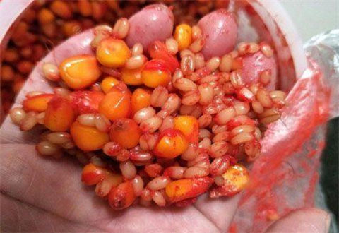 玉米是下午煮好,晾干回来已是晚上九点多,回来了还是迫不及待后续工作,牛B鲤,大曲酒,红糖,蜂蜜,阿魏粉等等一顿操作,终于调出了这一盆姨妈红。其实这些都是跟很多钓友的方法大同小异,小小的区别还是在量的控制,当然啦也是适合当地的水清鱼情,钓无定律只要能聚鱼都是好的窝料。