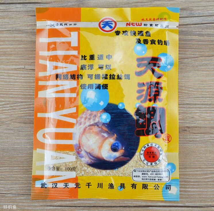 天源鲫(黄)是由武汉天元千川渔具有限责任公司出品的一款饵料。本品属天然香型钓鲫饵,比重适中,使用非常简单,对鲫鱼有特效,对草鳊亦有相当不错的效果,是竟技休闲必备品。将多年珍藏的饵秘方与多位钓王、垂钓大师的炼饵绝技融为一体,配合新型多倍力诱食剂,新工艺、新素材,绝对胜出。