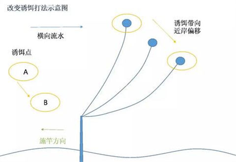 如下图,先在A处打下诱饵,然后在距离A点的远岸处抛下钓组,并操控钓组向岸边靠近,再根据流速在原诱饵点A点的近岸处、下游方向B点再打一次诱饵,这些诱饵最终会到达比第一次更近岸、更远的流尾方向,这样就可以形成一条逐渐靠向岸边的诱饵带,这样钓饵和诱饵就可以实现同步了。