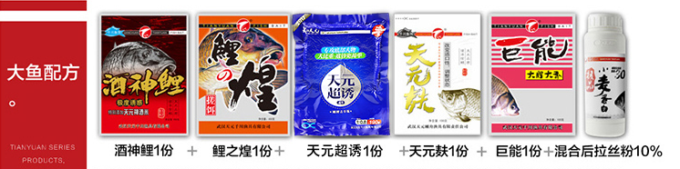 此配方适合在中国北方地区钓鲤鱼,使用时用量杯取200cc的饵料放入饵盆加一克左右的促食剂2号搅拌半均匀,再取180cc左右的水(也可根据个人用饵的软硬增减水的用量)加天元神酒1号2瓶盖左右倒入饵盆快速揽拌后放置10分钟左右就可以使用了,使用是可根据自己的习惯调整饵的软硬度,此饵非常适合在中国北方的水库、自然水城、野钓,非常好用。