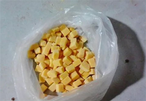 2.切好的饵料块可以做窝料也可以做饵料,做窝料的话可以取一部分小块,喷上一点白酒密封袋密封,第二天就可以打窝使用。做饵料的话可以直接挂钩使用,也可以到钓场后揉碎了再加入其它饵料。