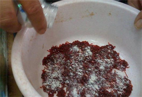 2、把红虫伴侣均匀撒在虫体表面,然后用五指轻轻搅拌均匀。