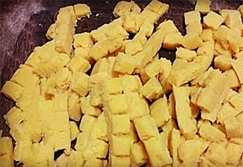 蒸熟的饵料自然冷却,拿出来后放在面板上,弄成1-2厘米的薄片。然后切成1-2厘米的小块,这样饵料就算完成了。需要注意的是嫩玉米糊本身就有一定的粘性,开水烫玉米粉也能增加玉米的粘性,所以这个配方中没有加入小麦粉。切好的小块撒上一层玉米粉,防止粘连,密封冷藏保存就可以了。