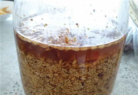 3.趁热把调好的液体,倒入炒好的窝料(趁热淋能充分吸收),搅拌均匀,凉后装密封罐。液体高出窝料1-2cm,密封罐上面留足够空间,便于膨胀及放气! 3.然后就是浸泡等发酵了!差不多一周左右就可以了,时间越长越好!