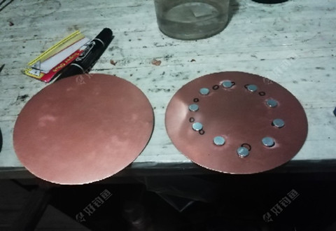 磁铁买小了,反正是野钓鲫鱼用,感觉也够用了,圆盘直径14厘米,磁铁摆的有点儿不太规律(请忽略),用502胶水粘好,用手掰了掰还行没掉。