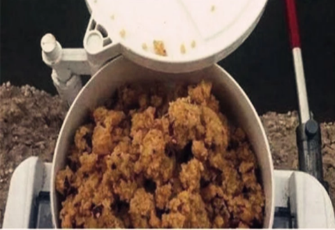 材料都准备好了,取出饵盆,将蒸好的红薯和炒好的米糠倒入搅拌,搅拌好之后,将炒香的黄豆粉混合物倒入,然后进行打揉,稍微打揉一下就将雪花粉和果酸粉倒入,快速的搅拌,然后捏成团,成团之后将橙汁混合物撒在饵料表面,反复2—3次就可以了,饵料就做好了。