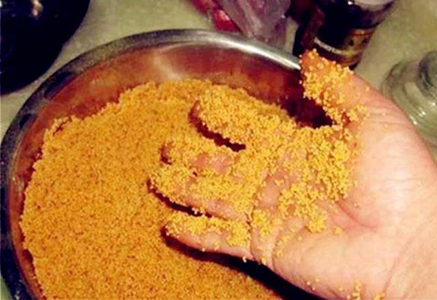 3.将玉米面加入少量清水打湿,然后揉和均匀后放到锅内蒸熟,再浆菜籽饼和麦麸也放到锅内炒香;