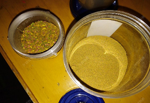 昨傍晚,进楼下小房间看下养的鱼。发现有股霉味。一查霉味源,原来是装密封袋的散炮饵全都成饼状了。赶紧清理进小区定点垃圾桶内。当时瓶子少就装了袋,是想着找瓶装的,人不能懒啊,一懒后果就如此。估计有个10斤散炮饵浪费了。接着又做了一脸盆散炮饵装瓶。估计一个秋冬季够用了。同时,又把蚕蛹腥的颗粒,打磨粉碎成沫状装瓶。就为了到时好添加到饵料中(鲫喜粉饵)。深秋冬季以钓大鲫为主。鱼活性与张口都比较小,所以,要粉碎成沫状。现在都得准备好了!