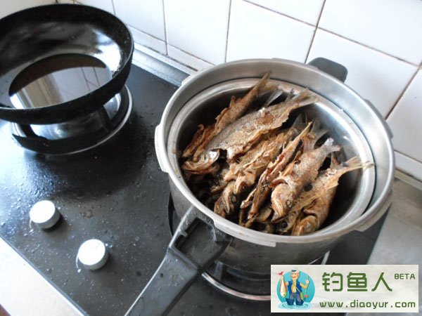 将炸好的小鱼码放容器内,倒入卤汁,放高压锅内,隔水压酥