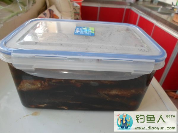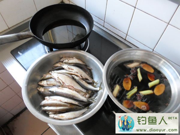 白条鱼去鳞、剪头、剔除内脏、洗净沥干水分,5斤鱼用15克盐和五香粉腌渍2小时以上,天热可放冰箱冷藏