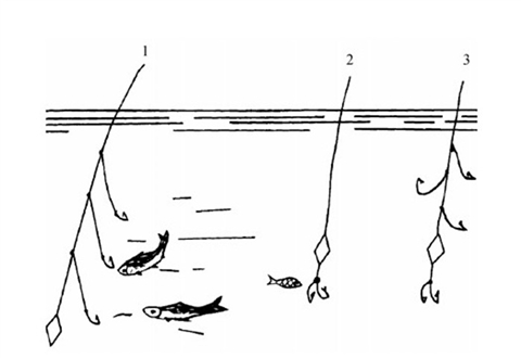 海竿和拉砣所使用的钓具主要有三种组合形式,即砣下钩、砣上钩和砣上砣下钩。