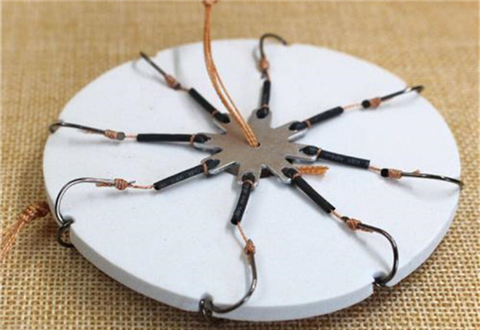 下面来说一说翻板钩的制作方法。首先备直径8厘米左左右、厚约2毫米的铁板(或铅板)、有机玻璃板各一块,都在中心处钻一个小洞,接着沿铁板的边缘钻七至八个小孔,分布要均匀哦,这样方便挂钩。再用一根中间略粗、两头有螺纹的小螺杆,从中心的晓东放进去把两板穿在两头,外边分别用小螺母拧紧、箍住。固定后的两盘间距为2厘米左右。将主线系于露在有机玻璃板的螺杆上。然后在铁板边缘的小孔上各挂一枚钩,钩游线长约6厘米。翻板钩的主线,要用0.6毫米以上的粗尼龙线,钩游线粗0.4毫米以上,用身宽10毫米固底钩或鹰嘴钩,不需要铅坠。