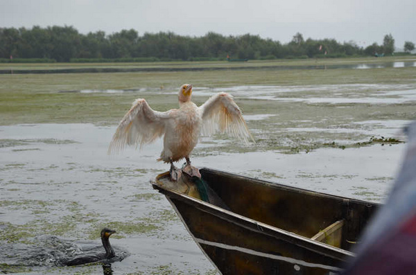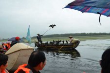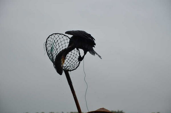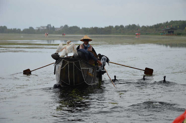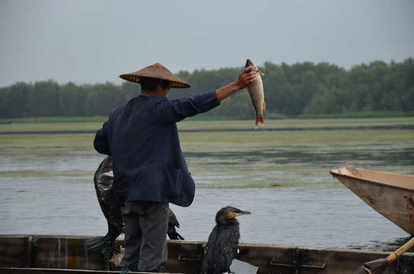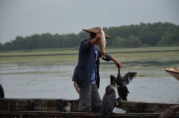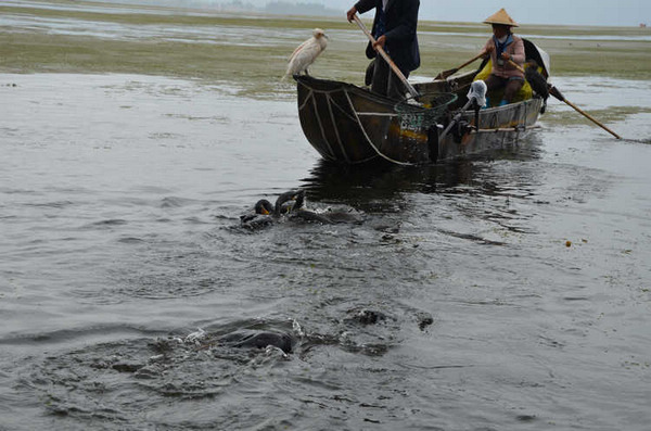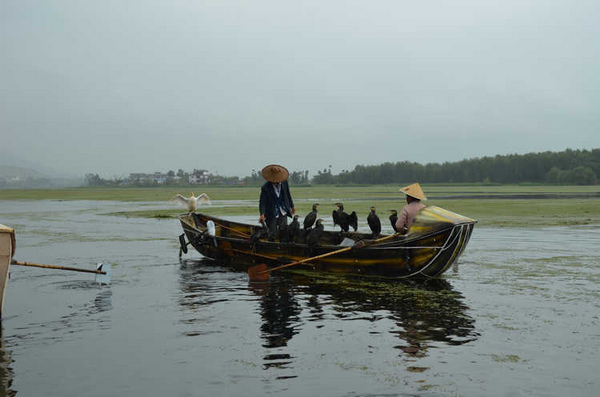 云南的九月似乎阴天特别多,而且这里的云彩离地面特别的低,云层就在山顶上缭绕不散。一艘专门进行鱼鹰捕鱼表演的小木船。 好像专门放飞的这只鱼鹰是捕鱼的好猎手,其他的鱼鹰则围着主人的船,等着习惯性的小鱼犒赏。主人拿着一罗小鱼喂鱼鹰,别的鱼鹰都在争着抢食。一阵惊呼声传 来,“捕到鱼啦!捕到鱼啦”,远看一群鱼鹰都围了上去,水面上激起很大的涟漪。主人则拿起抄网,瞄准时机连那只鱼鹰和被俘的鱼儿一起抄了起来。主人举着抄 网大声宣告:“捕到鱼啦!”言外之意就是这次表演获得圆满成功了!目测有2斤大小?仔细还能看见鱼身上被鱼鹰叼脱鱼鳞的痕迹。