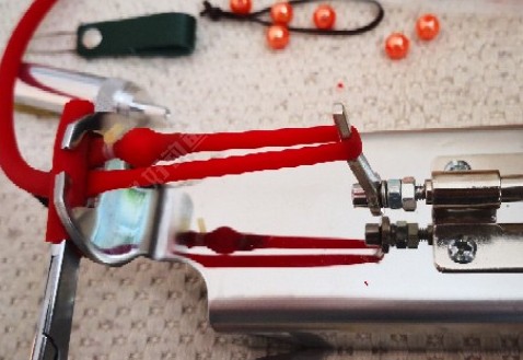 用做弹弓的架子拉紧橡筋管,然后用绑筋绑成死结。