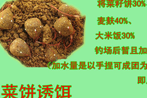 用菜籽饼粉(也可加入玉米粉或烂熟红薯等),用生面粉调和并加水,装入不透气的塑料袋中扎紧,夏秋气温高时,室内1~2天,室外1天便可发酵,若加入酸奶或醋则更快。菜籽饼以所钓鱼种广、效果好而著称。用菜籽饼粉做糟食饵,功效更胜一筹。根据配料的不同,它可以钓鲫、鲤、草、青、鳊等10余种鱼类,且上钩率高,收获量大,是一种经济实用,诱钓合一的好饵料。