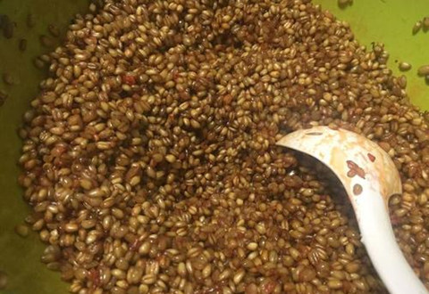 七、小麦放在暖水瓶里,把开水倒进去,记得要把水面上的麦壳捞走,盖紧盖子,闷大概两个半小时,等小麦开花。取出泡好的麦子,沥干,趁热加一袋鲫鱼香精,1矿泉水瓶盖曲酒和少许蜂蜜。出钓前一夜准备,第二天使用,一次一粒小麦即可。