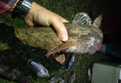 沙塘鳢又称笋壳鱼,是从东南亚引进的一种“名贵”经济鱼种,在云南、广西、贵州、广东等地都有人养殖。而因为其鲜美的肉质,笋壳鱼在市面上要卖到数十元乃至上百元一斤。不过,一般鱼市上的笋壳鱼,个头大都在半斤以下,二三两的居多,相较之下,这位钓鱼人李先生钓起来的沙塘鳢(两条,一条稍小)确实可以称得上是“沙塘鳢之王”了!