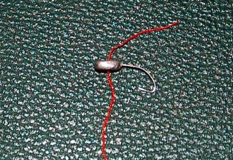 朝天钩的钩尖朝上,把线从配铅的下面穿过钩眼。