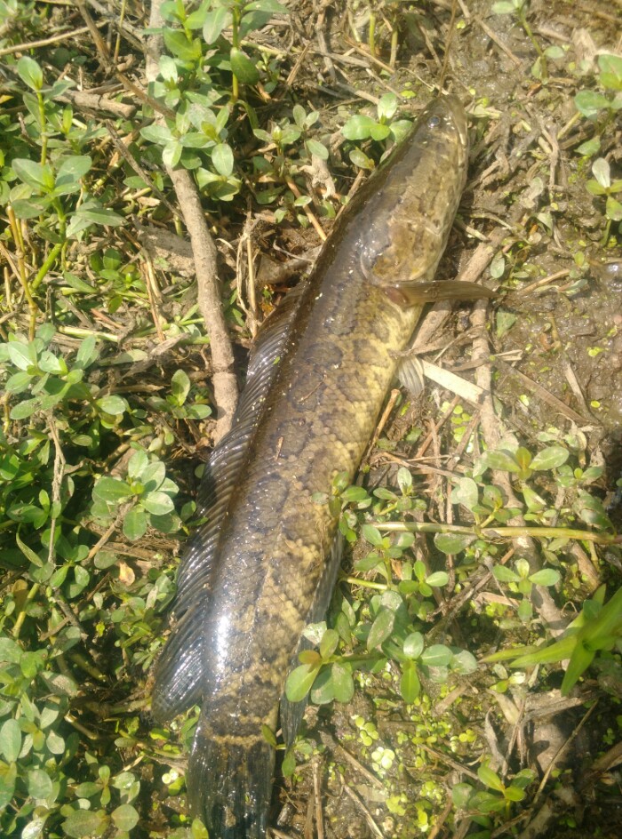 于是轻轻走到草丛的边上挑起竿子,将雷蛙放到两米长的钱,然后点逗水面,大概有10来分钟就看到旁边的草丛边上有草在晃动,感觉有戏,于是继续点逗水面,慢慢的将雷蛙点逗的方向,向黑鱼晃动的地方靠拢,刚刚接近晃动的地方,就听到砰的一声,黑鱼给口了,口声之后,线在迅速的下沉,看到线下沉之后,因为草比较厚,所以担心雷蛙不入嘴,所以稍微停顿了一下,看到冒气泡之后,扬竿直接将鱼飞上了岸,这条鱼有两三斤重吧,徒弟在旁边目瞪口呆,往常的时候这种换气孔离岸边都很远,但是今天无意中发现了这个离岸边有点近的,因为这旁边有房子,但是没有人住,也荒废了很多年了,可能是这个原因吧,如果有人住的话,边上肯定是不会有的。看来运气好的时候,真的是没办法阻挡。